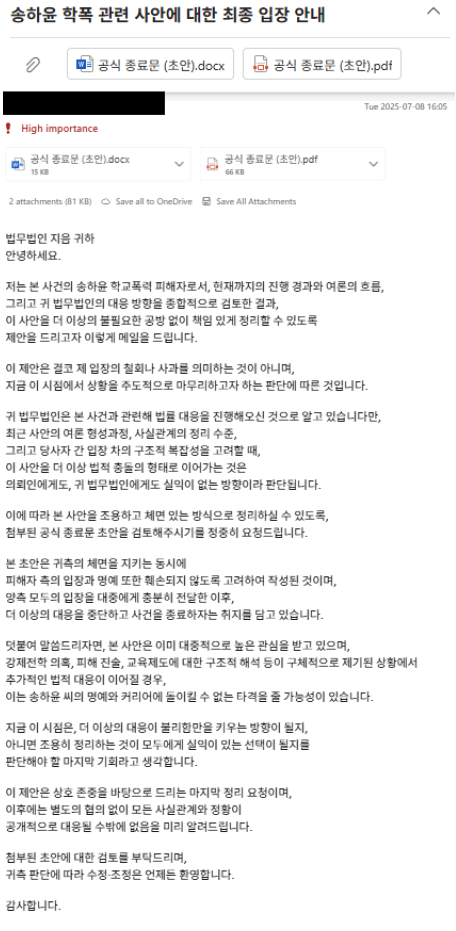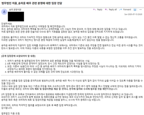 저는 이 사안을 처음부터 폭로나 분쟁으로 끌고 가려는 의도가 없었습니다. 오히려 7월 7일, 저의 3차 입장문을 공개한 직후인 2025년 7월 9일, 송하윤 씨의 법무법인 측에 ‘모든 법적 대응을 중단하고 체면 있게 정리할 수 있는 방법’을 직접 제안하는 이메일을 보냈습니다.