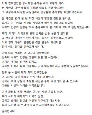 저는 분명히 말합니다. 명예로운 퇴장 기회를 준 쪽은 저였고, 그것을 묵살한 채 사실을 왜곡하려 한 쪽은 다름 아닌 바로 송하윤 측입니다.