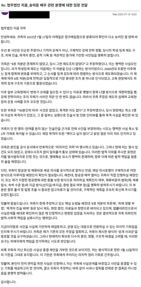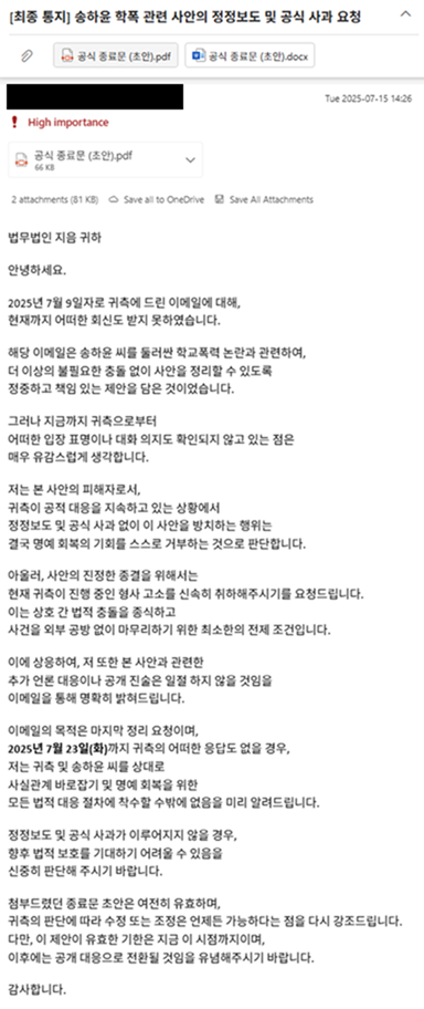 추후 확인한 송하윤 씨의 법무법인 측의 이메일 내용은 저의 제안을 무시했을 뿐 아니라, 오히려 그 제안을 악의적으로 왜곡하여 제가 허위사실을 자인하고, 공개 사과문을 내야 한다는 식의 요구를 역으로 보내왔습니다. 그들은 “8호 처분은 존재하지 않았고, ‘90분간의 따귀 사건’도 없었으며, 피해자인 제가 이를 인정하고 공개 사과해야 사건을 종결할 수 있다”는 입장을 공식 문서를 통해 전달하며, 제 정리 제안을 ‘허위사실 인정문’으로 왜곡하려 했습니다.