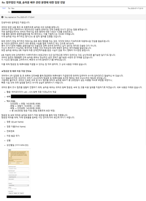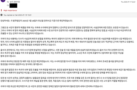 7월 14일 송부된 법무법인 측 이메일이 정크메일로 분류되어 뒤늦게 확인한 내용입니다.