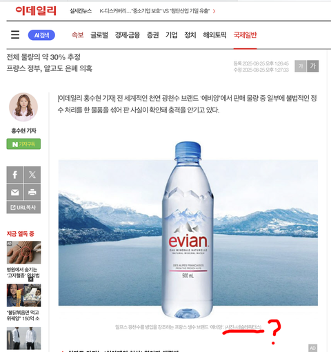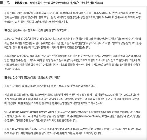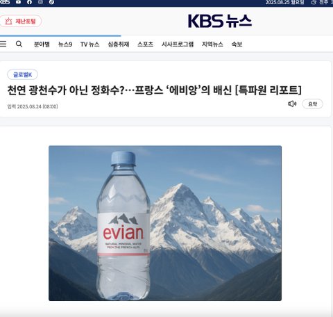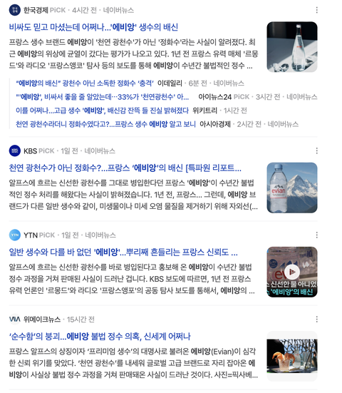 어제 KBS 기사를 봤어. 에비앙이 광천수가 아닌데 사기쳤다는 내용이고 지금 실시간으로 다른 언론사에서도 기사가 퍼지고 있거든.