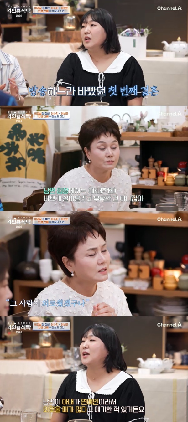 이경실은 후배 이수지에게 하는 조언으로 “젊을 때 마음껏 사랑해라. 일에 치우치지 말고. 나는 결혼을 한번 실패하고 또 결혼을 했다. 첫 번째 결혼 때 너무 바빴다. 정말 바빴다. 내가 최선을 다해서 잘사는 건 줄 알았다. 그게 어떻게 보면 남편 입장에서 그렇게까지 살아달라고 부탁한 건 아니다. 지금 생각해보면 그 사람이 외로웠겠구나 싶다”고 털어놨다.