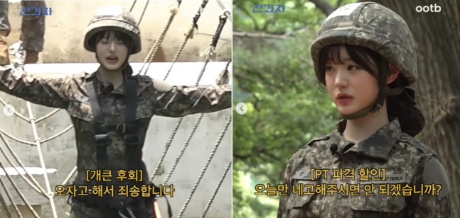 장원영은 교관의 명령에 따라 유격을 외치며 달리기를 하고 PT 훈련을 받은 뒤 실신지경에 이르자 "오자고 해서 죄송합니다"라고 소리쳤다.끝내는 마지막에 "여기 택시 잡힙니까?"라고 물어 웃음을 유발했다.