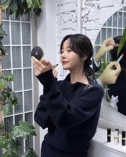 사진 속 채원빈은 어둡고 포근한 니트 톱을 입고, 머리는 자연스럽게 내려 한쪽 어깨 너머로 묶어 단아한 인상을 풍겼다. 차분히 집은 립스틱을 천천히 쥐고, 곁에는 우아하게 장식된 금빛 거울을 들어 자기만의 아름다움을 수줍게 완성해낸다. 흰 벽돌과 유리 블록이 빛을 부드럽게 반사하며, 조명은 채원빈의 표정에 섬세하게 스며든다. 측면의 원형 거울에 비친 손끝의 움직임이 그 고요한 집중의 분위기를 완성한다.