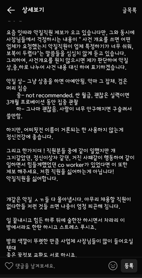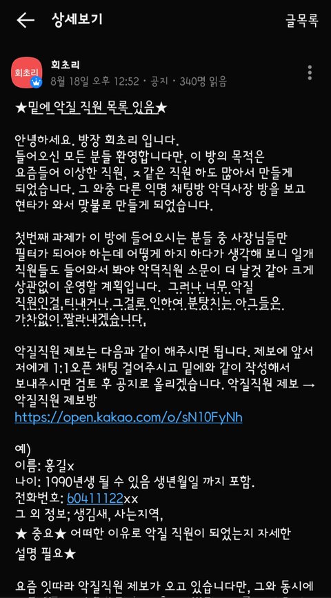 주민등록번호와 전화번호를 뒷자리 두 자리만 빼고 그대로 돌려보며, 서로 “이 사람 조심해라” 식으로 낙인찍는 식으로 운영됩니다.