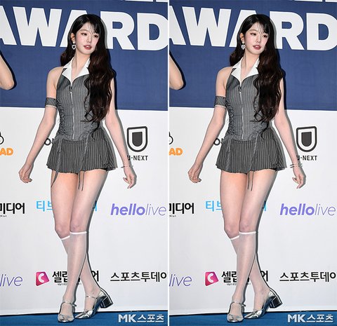 이날 장원영은 역대급 초미니 투피스에 시스루 삭스와 실버 구두를 매치해 173cm의 우월한 기럭지를 드러내며 독보적인 비주얼을 선보여 완벽한 블루카펫 룩을 완성했습니다.