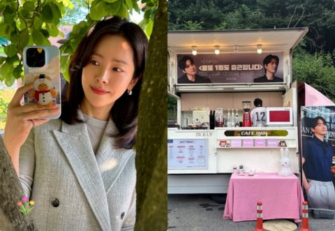 공개된 사진에는 한지민이 이준혁이 주연으로 하는 '로또 1등도 출근합니다' 촬영 현장에 커피차 선물을 보낸 모습.