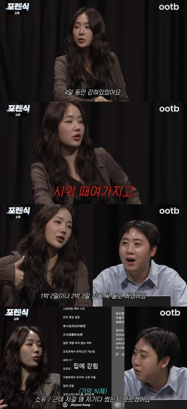 소유는 "저게 왜 써져있는지 모르겠는데 (집에) 4일 동안 갇혀있었어요. 시위 때여가지고. 저 때 한 번 나가면 혹시라도 못 들어갈 수 있으니까 1박 2일이나 2박 3일 짐을 싸 들고 다녔다"고 해 웃음을 더했다.
