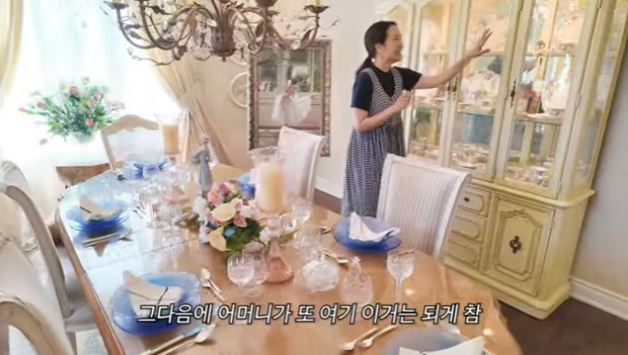 거실 옆에 있는 다이닝룸으로 이동한 그는 "다이닝 테이블을 엄마가 세팅하는걸 좋아하신다. 그래서 테이블 세팅 해놓고 에전에 손님들 초청하고 그랬을때 엄마가 세팅 해놓고 음식 많이 만들어놓고 그랬다. 항상 다르게 세팅한다. 2주에 한번씩"이라며 고급 식기를 풀세팅해둔 유리장을 공개했다.