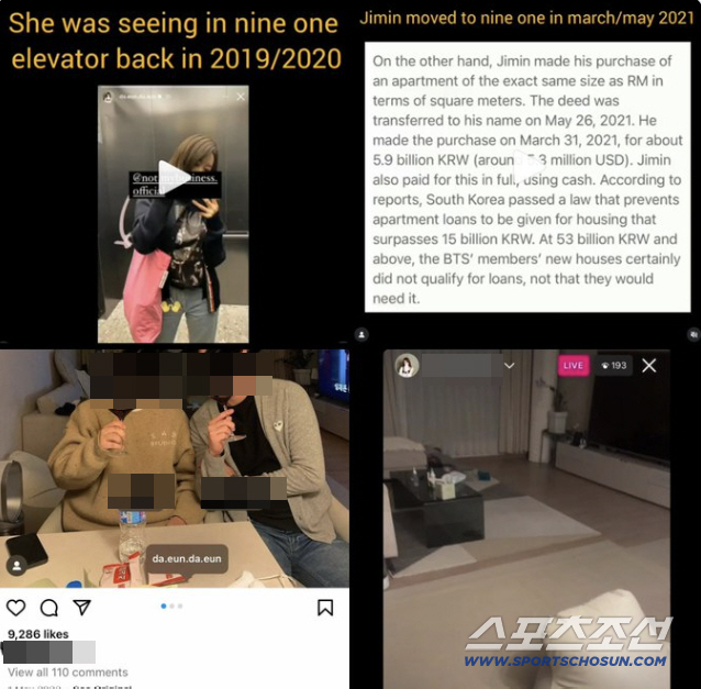 이와 관련 송다은과 지민 측은 여전히 침묵을 지키고 있다.송다은은 최근 자신의 계정에 지민과의 집데이트 영상을 공개해 파란이 일었다. 공개된 영상에는 지민이 "아 깜짝이야. 나 들어오는 거 알았어? 일부러 말 안하고 온건데"라며 엘리베이터에서 내리는 모습이 담겼다. 이 과정에서 '나인원 한남'이라고 적힌 엘리베이터 내부 인테리어가 공개됐고, 나인원 한남은 지민이 거주 중인 곳이라 뜨거운 관심이 집중됐다.