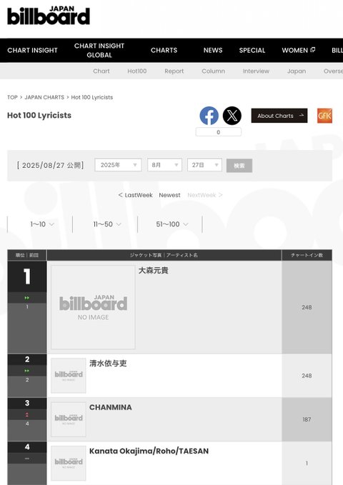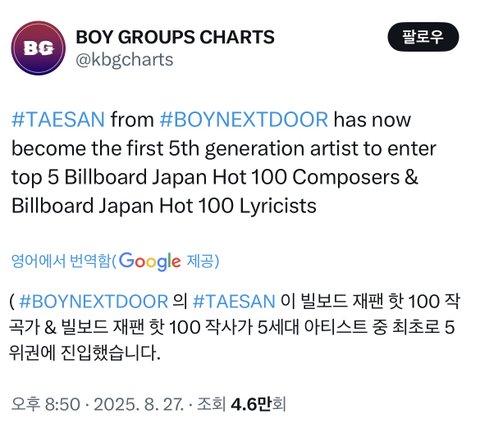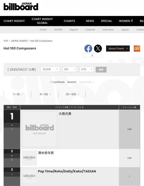 보넥도 태산 빌보드 재팬 핫100 작곡가 3위 & 작사가 4위
