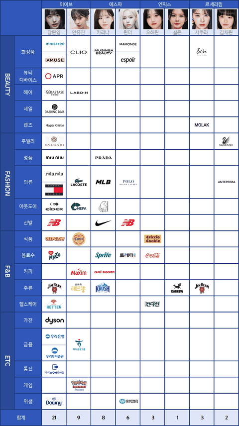 장원영, 안유진, 카리나, 윈터, 오해원, 설윤, 카리나, 김채원, 아이브, 에스파, 엔믹스, 르세라핌