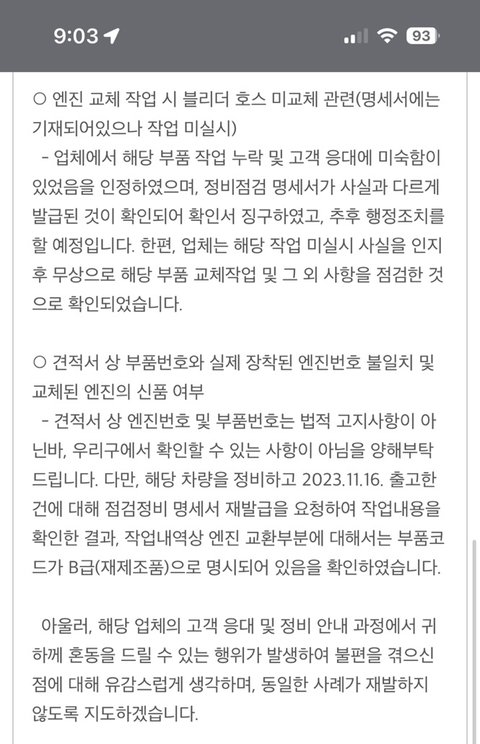 저는 수차례 “정말 새 엔진이 맞느냐”고 물었지만, 센터는 끝까지 “맞다”는 답만 반복했습니다.