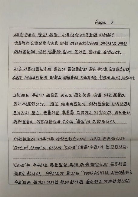 김 전 장관은 서신 말미에서 “보다 자유롭고 깨끗하며 정의롭고 미래지향적인 대한민국을 소망한다”며 “더 큰 용기와 지혜를 달라”는 기도를 덧붙였다. 끝으로는 “YOON AGAIN! 자유대학 애국청년 화이팅!”이라는 구호로 마무리했다.