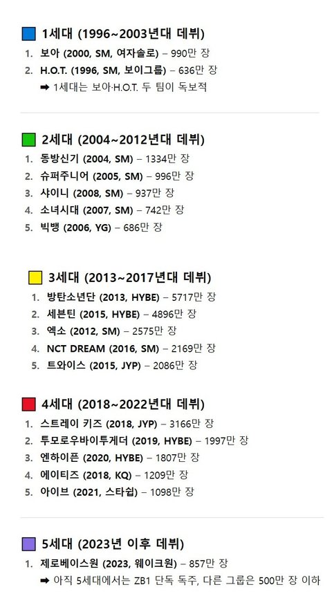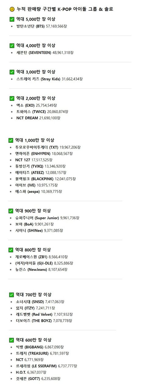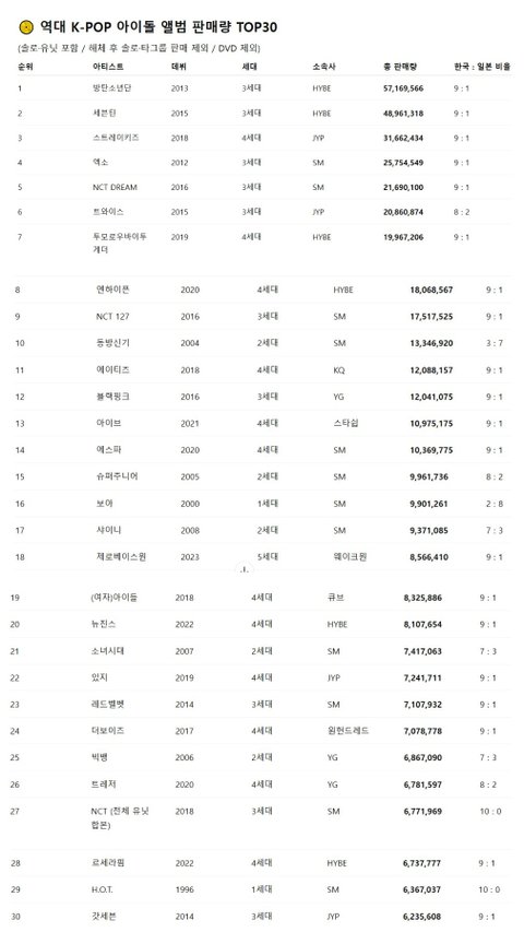 역대 케이팝 아이돌 앨범 판매량 TOP30 ※그룹은 유지한채 개별활동이 많아진 관계로 솔로, 유닛판매량 포함(단 그룹 해체이후의 솔로 판매량, 타그룹 재데뷔이후의 판매량은 미포함. DVD 판매량 역시 제외)