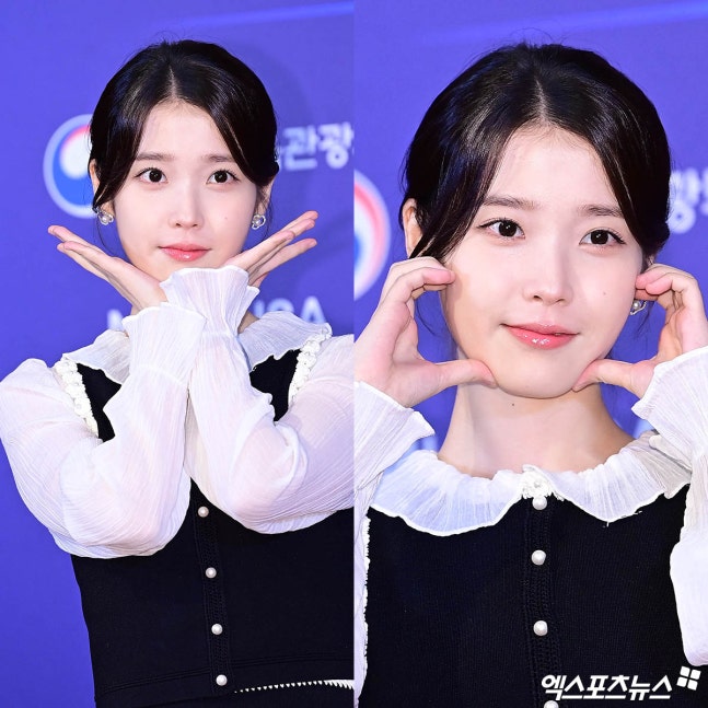 또한 아이유는 손하트, 꽃받침 포즈 등 귀여운 제스처로 다채로운 매력을 뽐냈다. 청순함과 러블리함을 동시에 자아내 눈길을 끌었다.