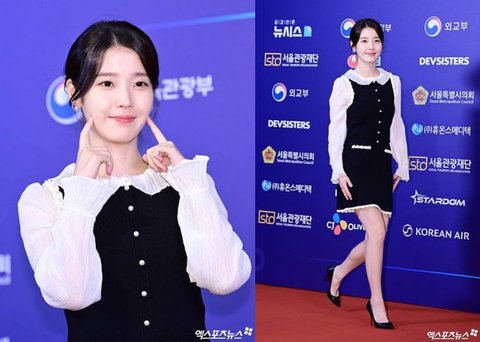 이날 아이유는 블랙 원피스에 화이트 블라우스를 매치한 의상을 입고 고급스럽고 단정한 무드를 연출했다. 블라우스는 은은한 시스루 소재와 프릴 디테일로 청순미를 더했고, 블랙 원피스는 진주 버튼 장식이 포인트로 들어가 클래식한 매력을 배가시켰다. 하단과 포켓 라인에 더해진 화이트 레이스 장식은 전체적인 룩에 러블리한 감각을 불어넣었다.