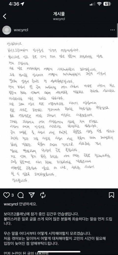 보플 김건우 새벽에 사과문 몰래 삭제했네? ㅋㅋㅋ