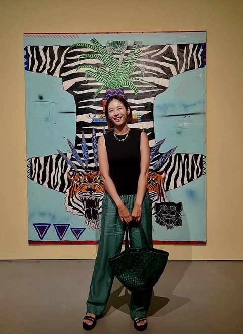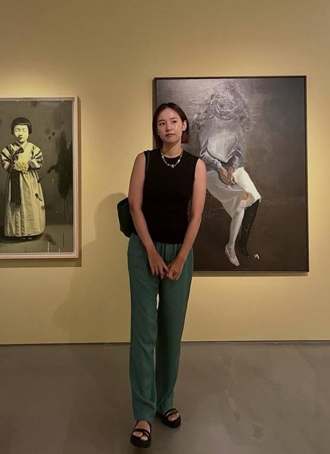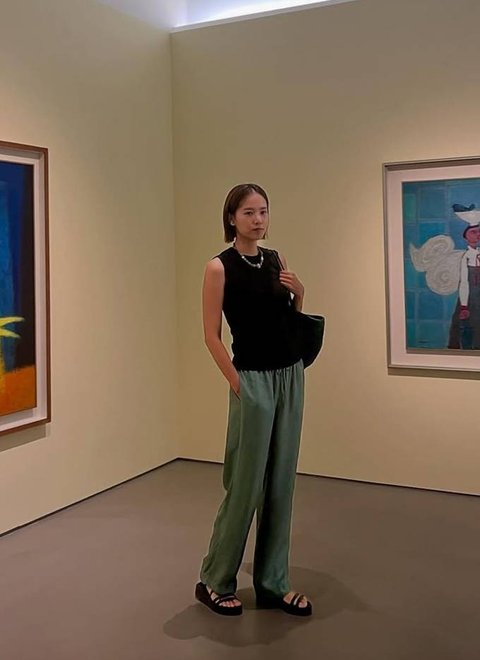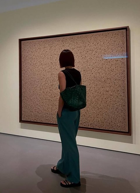 여기에 그린 컬러의 위빙 토트백을 더해 아트 전시회 분위기와 어우러지는 감각적인 포인트를 주었으며, 블랙 스트랩 샌들로 편안함과 스타일을 동시에 챙겼다.