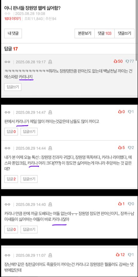 +비호감팬덤인 카리나팬들이 원영이를 욕하지 말라는글에 툭 튀어나와서 추하게 카리나를 언급하면서 장원영을 욕하고 있음ㅉ(애네는 원영이한테 열폭하나봄)
