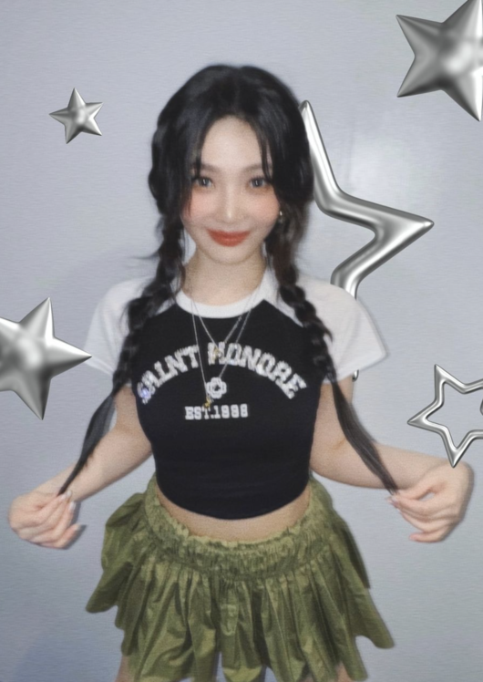공개된 사진 속에서 조이는 검정색 반팔 크롭 티셔츠와 카키색 미니 스커트를 매치하여 사랑스러움을 더했다. 양 갈래로 땋아 내린 긴 흑발머리는 조이의 상큼한 분위기를 한껏 살려주었다.