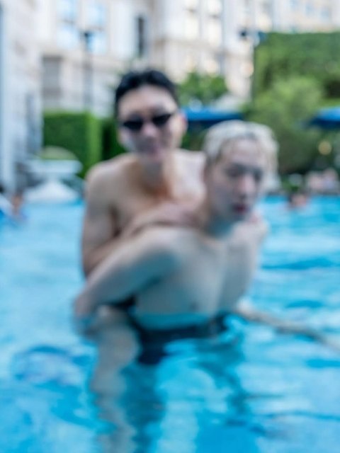 강승윤은 "둘이서 수영하다가 이왕 사진 찍으려고 타이머 설정을 해놓고 찍었는데 포커스가 잘 안 맞아서 이렇게 나왔는데 오히려 다행이다. 모자이크 한 것처럼 보여 다행"이라고 설명했다.
