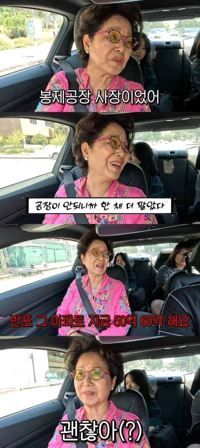 사진 = 유튜브 채널 '순풍 선우용여'아파트 4채를 팔았다는 이야기에 제작진은 말을 잇지 못했고, 선우용여는 "괜찮다"며 분위기를 편안하게 만들었다. 제작진이 "반포 그 아파트 지금 50억, 60억 한다"고 하자 선우용여는 "그거 뭐 생각하냐. 이미 지나간 거다. 내가 스스로 성격이 좋은 건 뭐냐면, 나는 어제 일 생각 안 한다. 지나간 걸 뭐 하러 생각하냐. 골치 아프게. 지금 오늘이 재밌고 잘 살면 된다"고 긍정적인 면모를 보였다.