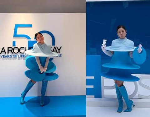 박나래는 푸른색 원형 판이 겹겹이 둘러진 독특한 드레스를 착용했다. 브랜드 아이덴티티를 형상화한 듯한 모습. 브랜드의 시그니처 컬러인 블루를 기반으로 제작돼, 부츠와 장갑까지 톤을 맞춰 완성도를 높였다. 행사 현장에서 박나래는 특유의 유쾌한 표정과 포즈를 선보였다.