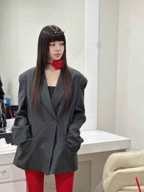 공개된 사진 속 남규리는 풀뱅 앞머리를 내린 긴 생머리와 그레이 핀스트라이프 재킷, 붉은 장미 초커로 강렬한 분위기를 자아냈다. 손끝으로 머리카락을 살짝 들어 올린 포즈는 도도한 매력을 더했고, 대기실 거울 앞에서는 양손을 주머니에 넣은 채 시선을 고정해 카리스마를 발산했다.