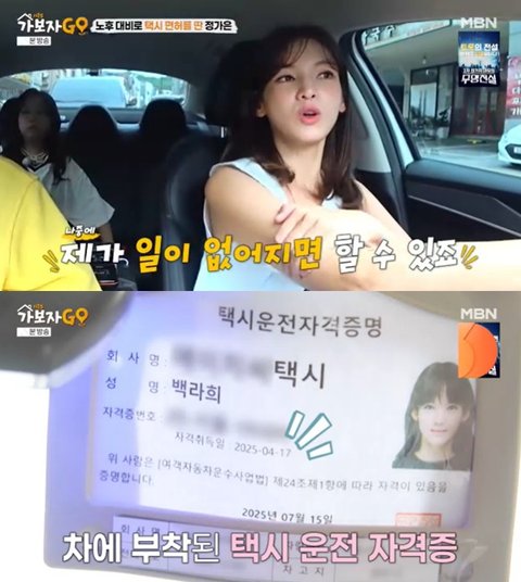 /사진=MBN '가보자고5' 방송 캡처정가은은 자신의 본명 '백라희'를 내건 택시운전사 자격증을 공개했다. 그는 택시운전사를 겸업으로 하게 된 이유를 묻자 "제가 유튜브를 하면서 콘텐츠를 뭘 하면 좋을까 하다가 제가 가장이니까 제2의 직업을 가질 만한 걸 하고 싶었다. 회사에서 '택시를 하면 어때요?'라고 하더라. 제가 볼 땐 택시 일이 재미있어 보였다. 저희 아빠가 무사고 개인택시 운전자였다"고 말했다.