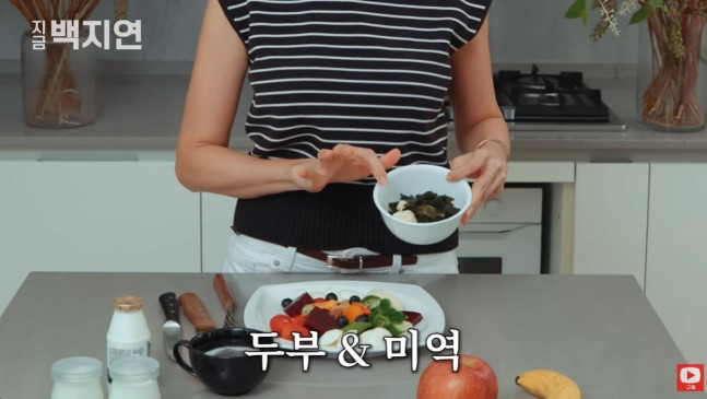 사진 = 유튜브 채널 '지금백지연' 캡처그가 공개한 아침 식단은 소금을 끊고 당을 낮춘 삶은 달걀, 미역, 오트밀, 다양한 채소, 두부 등으로 구성됐다. 특히 케일과 아스파라거스, 브로콜리, 샐러리, 아보카도 등을 적절히 요리해 섭취하고, 요거트에 과일과 견과류를 곁들여 영양 균형을 맞춘다고 밝혔다.