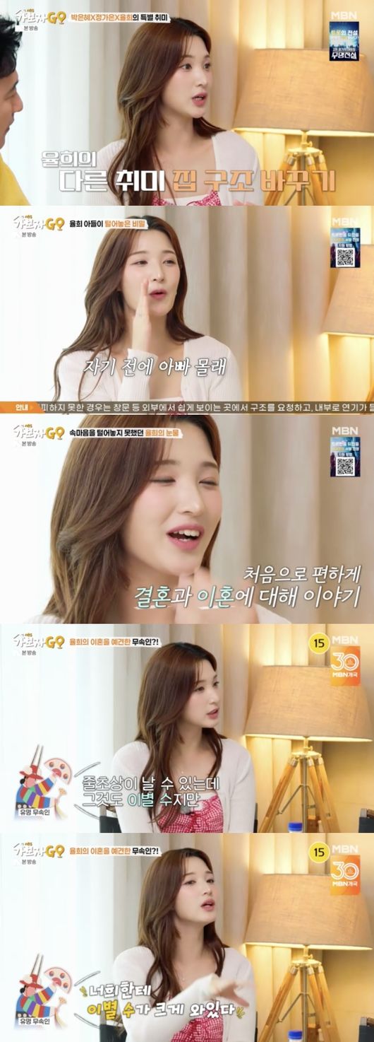 이혼 후 혼자 살고 있는 율희는 자신만의 스트레스 푸는 방법을 공개했다. 그는 “책 읽기, 노래 듣기, 그런 걸로 스트레스를 푼다. 집 구조 바꾸는 걸 좋아한다. 제가 혼자 사는 집도 2년 살았는데 10번 이상 배치를 바꿨다"라고 말했다.