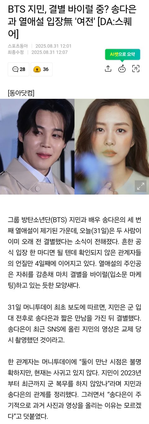 BTS 지민, 결별 바이럴 중? 송다은과 열애설 입장無 '여전' [DA:스퀘어]