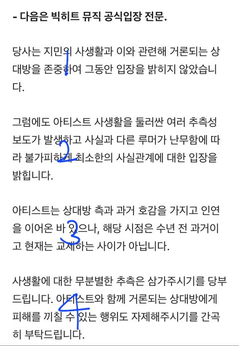 입장문을 빨리 내지 못 했던 이유를 설명함 하지만 금방 사그라들 주제가 아니었기때문에 빠른 대처를 하지 못했던 상황판단이 아쉬움 헤어진 관계였다면 그 분이나 가수나 팬들을 위해서라도 빨리 입장문을 냈었어야 함