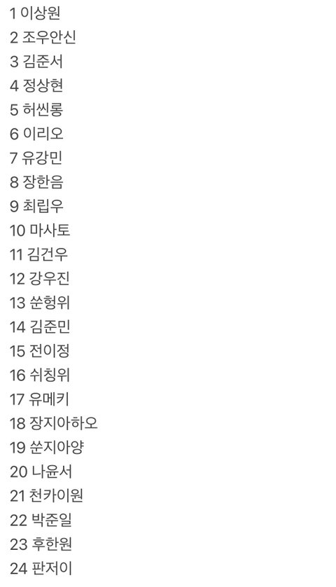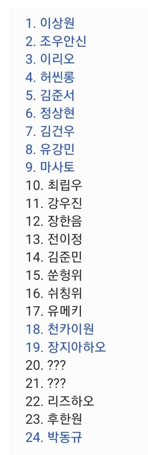 뭔솔 저건 아예 구씹이고 이게 맞음... 여기에 나윤서 생존이고ㅇㅇ 24위도 박동규야 판저이 아님. 쑨지아양도 떨어졌어. 중남은 여기있는 7명이 끝임