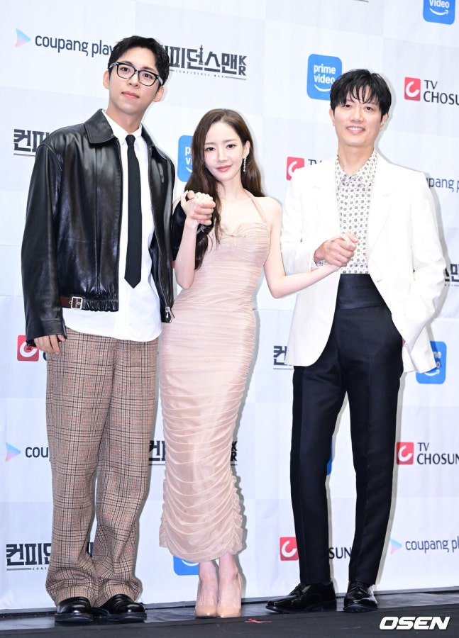 [OSEN=최규한 기자] 1일 오후 서울 상암동 스탠포드 호텔에서 TV CHOSUN 새 주말 미니시리즈 ‘컨피던스맨 KR’ 제작발표회가 열렸다.‘컨피던스맨 KR’은 다재다능한 능력을 보유한 사기꾼 3명이 이 시대의 악당들을 향한 복수에 나서는 케이퍼 코믹물이다.배우 주종혁, 박민영, 박희순(왼쪽부터)이 포토타임을 하고 있다. 2025.09.01 / dreamer@osen.co.kr‘컨피던스맨 KR’의 또 다른 재미는 주연배우들 못지 않은 특별출연 라인업이다. 송지효를 시작으로 김보성, 윤채경, 로운, 오나라, 김선영, 이이경 등이 ‘컨피던스맨 KR’을 더욱 풍성하게 할 예정이다. 남기훈 감독은 “친분을 떠나서 캐릭터와 부합하느냐를 통해 리스트업을 진행했다. 그 다음에 인맥과 술자리를 통해서 적극적으로 대시를 하고 삼고초려하면서 흔쾌히 수락해주셨다”고 말했다.