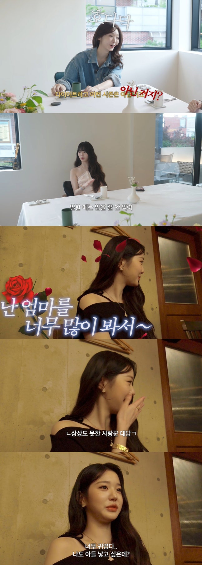장원영은 강민경이 "다이어트하는 시즌 아니냐"라고 묻자 "먹고 싶을 때는 많이 먹는데 일하거나 조금 스트레스받으면 입맛부터 떨어져서 일할 때는 밥을 잘 안 먹는다. 하지만 지금은 완전 먹고 싶은 상태다"라며 설렘을 드러냈다. 이어 "난 한 끼를 먹어도 맛있는 걸 먹거나 아예 안 먹는 편이다. 왜 마음에 안 드는 걸 먹나"라며 귀여운 소신도 전해 눈길을 끌었다.