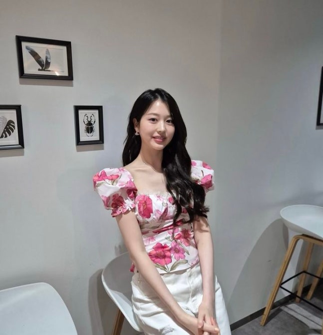 사진 속 장다아는 꽃무늬 블라우스에 흰색 바지를 매치해 사랑스러운 분위기를 자아냈다.