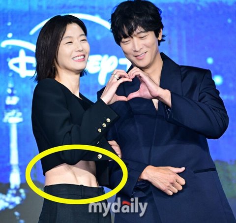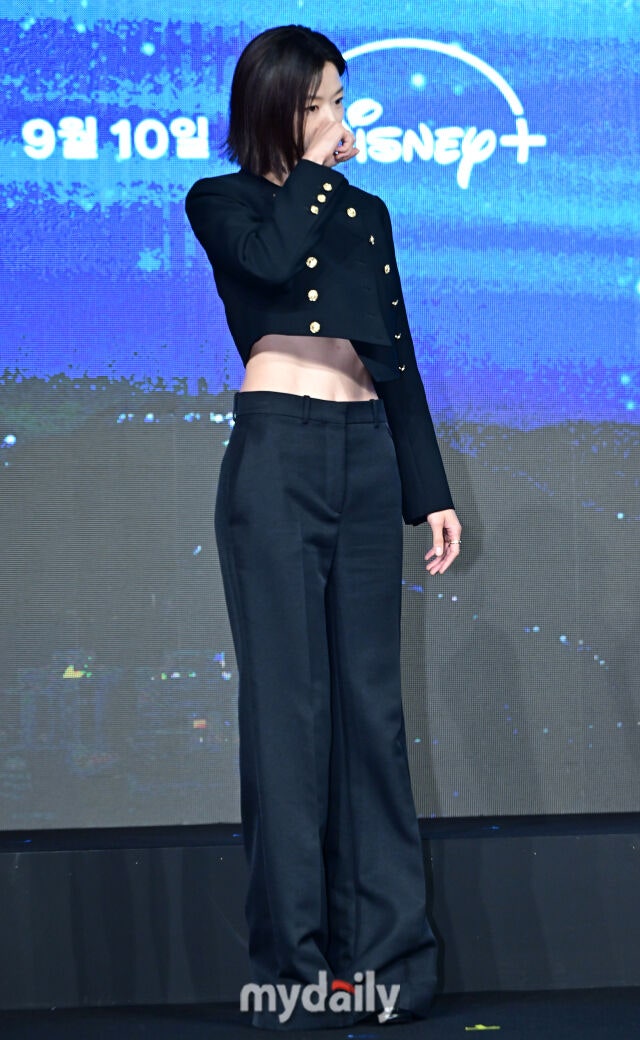 깔끔한 단발은 173cm의 키의 완벽한 비율을 더욱 돋보이게 했다. 강동원과 함께 포즈를 취하던 중 하트를 만들기 위해 오른팔을 들어 올릴 때 크롭 패션에 놀랄 만큼 완벽한 복근이 드러났다.
