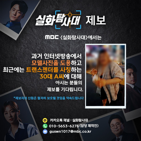 MBC <실화탐사대>에서 과거 인터넷방송에서 모델사진을 도용하고 최근에는 트랜스젠더를 사칭하는 30대 A 씨에 대해 아시는 분들의 제보를 기다립니다.