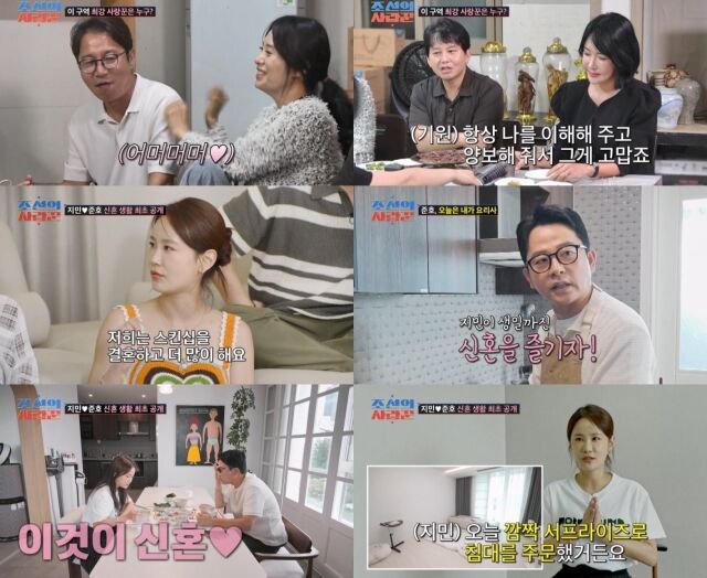 '조선의 사랑꾼'/TV조선이어 결혼 한 달 차인 김지민·김준호의 풋풋한 신혼생활이 공개됐다. ‘예비 신부’ 최연수는 “연애 때 많이 붙어있었는데, 신혼이면 연애 때랑 느낌이 달라지나요?”라고 물었고, ‘선배(?) 신부’ 김지민은 “훨씬 좋다. 안정감이 달라지고 더 애틋해진다. 저희는 스킨십을 결혼하고 더 많이 한다”며 결혼을 추천했다. 한편 VCR에서는 김지민을 위해 아침을 준비하는 김준호의 모습이 포착됐다. 설정 같은 상황에 김준호는 “결혼은 설정해서 매일 이벤트를 해줘야 행복한 거다. 원래 하는 거다”라며 이벤트에 진심인 모습을 보였다. 아침 메뉴는 ‘아보카도 샌드위치’였고, 과거 충격의 요리 실력을 선보였던 것에 비해 김준호는 순조로운 준비로 결혼 후 달라진 모습을 보였다.