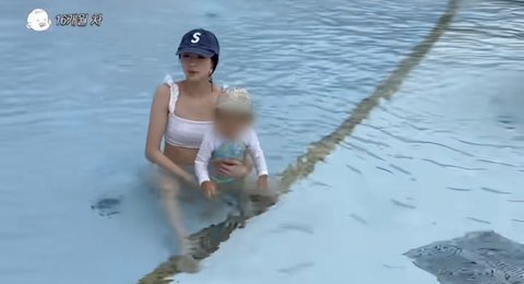 손연재는 한 호텔의 야외 수영장에서 아들과 함께 수영했다.