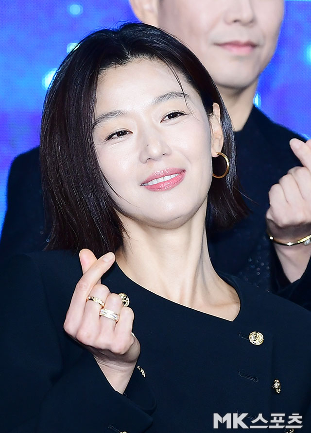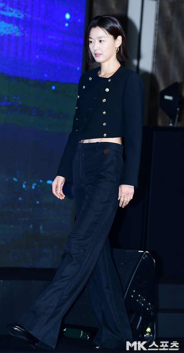 이날 전지현은 블랙 크롭 재킷과 팬츠를 매치해 군살 없는 복근을 드러내며 무대에 올랐다. 당당한 포즈와 여유 있는 미소는 현장을 단번에 압도했다.