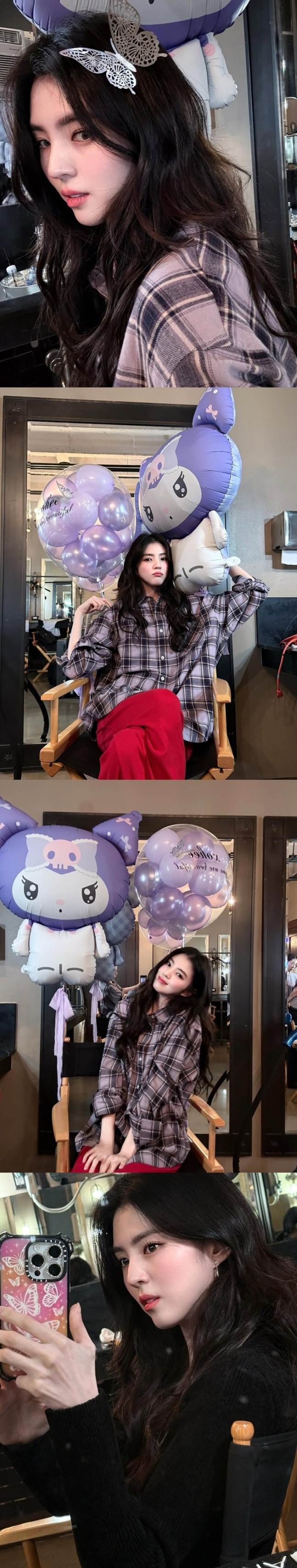 몽환적인 분위기를 자아낸 그는 캐릭터 쿠로미 풍선을 껴안고 다양한 포즈와 표정으로 팬들의 마음을 울렸다. 캐릭터와 잘 어울리는 보라색 체크무늬 셔츠로 '인간 쿠로미'가 된 한소희의 러블리함이 눈길을 사로잡는다.