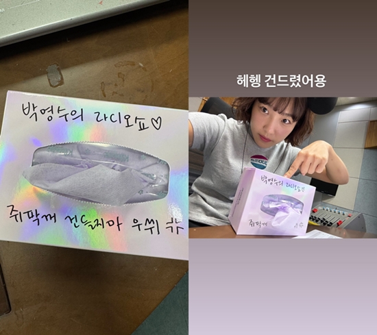 지난 2일 이은지는 "헤헹 건드렸어요"라는 글과 함께 곽티슈를 누르고 있는 사진을 올렸다. 이은지가 짚은 곽티슈에는 '박명수의 라디오쇼', '쥐팍거 건들지마 우쒸'라는 글이 적혀있다.