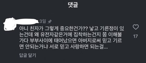 난 여잔데 내 자식 아니면 절대 못키우는데 친자인지 아닌지 당연히 ㅈㄴ중요하지 뭔