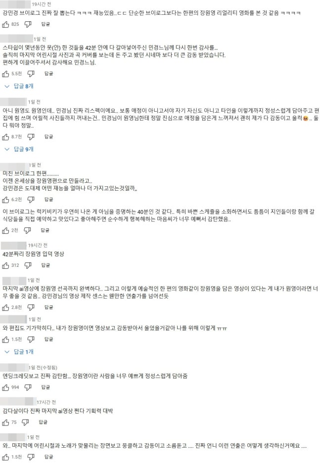 장원영에게 쏠리던 시선은 곧 채널 주인인 강민경에게 향했다. "자신의 일상도 아닌 타인의 일상을 이렇게까지 정성스럽게 담아주는 게 좋아 보인다"며 시청자들이 강민경의 영상 연출과 기획력을 극찬한 것. 영상 끝 무렵에서는 장원영의 어린 시절부터 지금까지의 성장기를 AI로 복원하는 기술이 사용됐다.