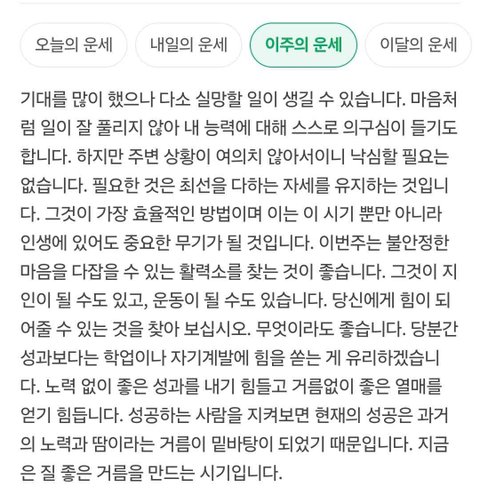 하루운세는 안맞고 이주의 운세가 ㄹㅇ임 한달운세도 좀 맞긔 오늘 모고개쳐망한고 저말 딱 그대로야 이것 말고도 맞은거 많음