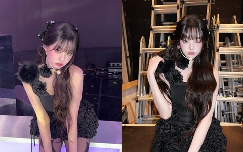 장원영 소셜미디어사진 속 장원영은 코르사주 장식이 포인트 된 블랙 미니 드레스를 입고 반묶음 헤어스타일을 한 채 인형 같은 미모를 드러내고 있다.