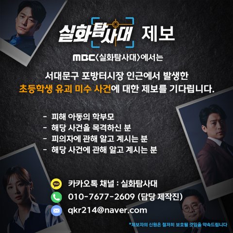 MBC <실화탐사대> 에서는 서대문구 포방터시장 인근에서 발생한 초등학생 유괴 미수 사건에 대한 제보를 기다립니다.